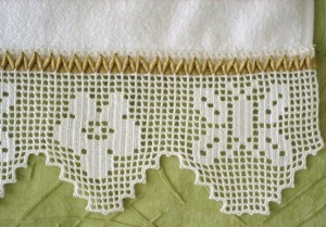 Beyaz havlu kenarı dantelimiz 50 gramlık dantel ipi ile işlenmiştir.Örgümüz 22 numara dantel tığı ile örülmüştür.İlk olarak 20 adet zincir çekilkerek üzerine biritlerle kutucuk yapaılarak işlenmiştir.Daha sonra kutunun içleri dolgu yapılarak desnimiz işlenmiştir.Dantelimizde iniş çıkışlar vardır.Havlu kenarlarımızı süsleyecek şık bir havlu kenarı modelidir.