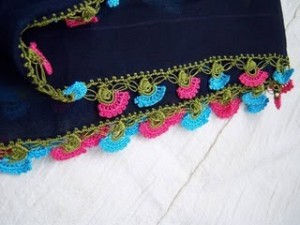 Çiçekli oyamız üç renk iple işlenmiştir.Oyamız 21 numara dantel tığı ile örülmüştür.İlk olarak yazmamızın dört kenarını birden yeşil iple çevrenlmiştir.Daha sonra o çevrenin üzerine yeşil iple çiçeğimizin dal kısmı yapılmıştır.Daha sonra sırayla bir pembe,bir turkuaz mavisi oya ipiyle çiçek bölümü yapılmıştır.Gerçekten işlemesi zevkli olan bu oya modelimiz çok harika bir örnek olduğunu düşünmekteyim.