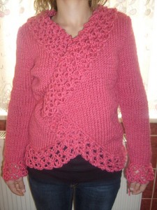 Pembe örgü bayan hırkamıza 5 adet ip gitmiştir.Örgümüzde şiş ve tığ kullanılmıştır.Bayan hırkamız 2 ön,1 arka,2 kol olarak işlenmiştir.Örgü bayan hırkamızda düz örgü tekniği kullanılmıştır.Hırkamızda eksiltmeler ve arttırılmalar olmuştur.İşlenip bittikten sonra hırkamızın kenarına tığ ile örümcek ajuru yapılmıştır.Çok basit ve işlemesi zevkli lan bir örgü modelidir.